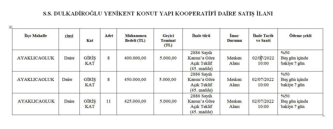 1. Yukarıdaki tabloda özellikleri ve ihale bilgileri belirtilen mülkiyeti S.S.Dulkadiroğlu Yenikent konut yapı kooperatifine ait 27 adet giriş kat dairenin satış ihalesi Açık Teklif usulü belirtilen tarih ve saat’te, S.S Dulkadiroğlu Yenikent konut yapı kooperatifi şantiye alanında yapılacaktır.