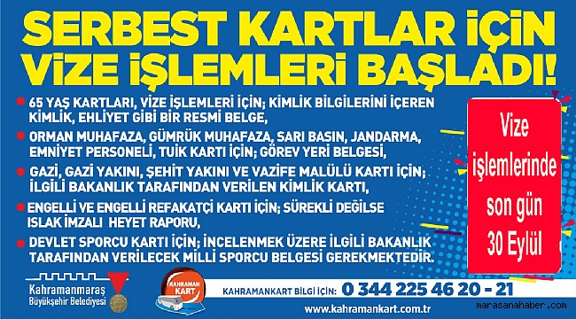 Büyükşehir Belediyesi kahramankart serbest kullanıcıları için vize yenileme süresinin 30 Eylül’e kadar uzatıldığını açıkladı. Kahramanmaraş Büyükşehir Belediyesi Kahramankart kullanıcılarının vize işlemleri ile ilgili bir açıklama yaptı. 22 Temmuz tarihinde başlayan vize işlemlerinin devam ettiğinin belirtildiği açıklamada, “Hemşerilerimizin talebini karşılama amacıyla vize işlemleri 30 Eylül tarihine kadar uzatılmıştır. Gerek basın yoluyla gerekse açık hava reklam alanlarında hemşerilerimize sürekli bilgilendirmeler yapılmaktadır. Kahramankart İşlem Merkezi, Ulucami Dolum Noktası, tıp fakültesi Dolum Noktası ve öğrenciler için Kahramankart Kiosk Dolum Noktaları gibi birçok seçenekle vize yenileme işlemi yapılabilmektedir. Kamuoyuna saygıyla duyurulur” ifadelerine yer verildi.