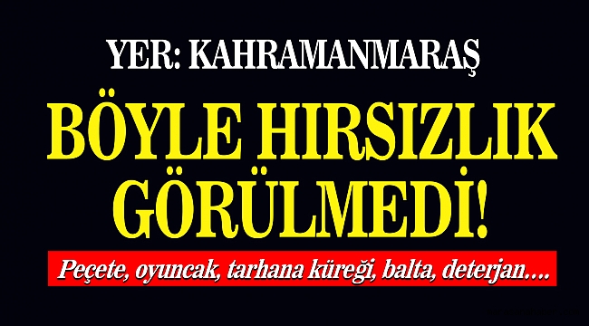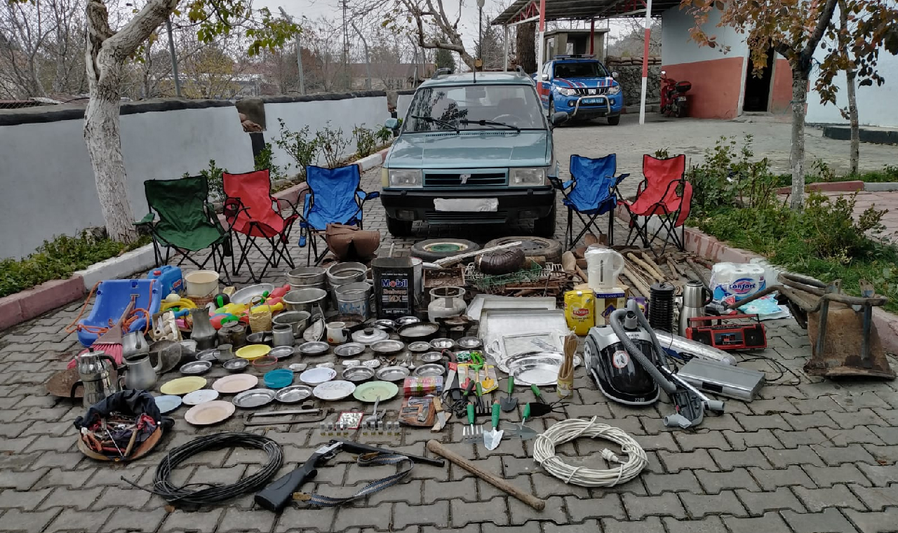 Kahramanmaraş’ın Dulkadiroğlu ilçesi Budaklı Mahallesi’nde bulunan C.Ç.’ye ait bağ evinde meydana gelen hırsızlık olayında jandarma ekipleri, hırsızları şans eseri yakaladı. Kahramanmaraş’ta C.Ç’ye ait bir evi soyan hırsızların çaldıkları, bu kadarına da pes dedirtti.Hırsızlık olayı, bölgede devriye atan jandarma ekiplerince açığa çıktı. Edinilen bilgilere göre; Jandarma devriye ekiplerince dün saat 12.00 sıralarında şüphe üzerine durdurulan 46 plakalı Tofaş kartal marka araç içerisinde bulunan Y.K. ve C.K. isimli şahısların üzerleri ile araç içerisinde arama yapıldı.Yapılan aramada; 2 adet kütük, 1 adet anahtar takım çantası,1 koli peçete, 20 m ara kablo, 20 m çelik halat, 1 adet demir kesme makası, 2 adet keser, 1 adet manila, 2 adet kazma, 1 adet balyoz, 3 adet kürek, 1 adet tarhana küreği, 6 adet 1 m 12'lik demir, 1 adet stepne, 1 adet mangal, 4 adet tatlı tepsisi, 4 adet satır, 1 adet ketıl, 4 adet çay tepsisi, 5 adet sandalye, 1 adet elektrikli süpürge, 1 adet ekmek saçı, 4 adet çaydanlık, 1 adet dijital dvd, 25 adet tabak, 10 adet çocuk oyuncağı, 3 paket 1 kg çay, 1 adet kaset çalar, 2 adet testere, 1 adet prenses marka NBD12-76TS870TM seri numaralı tek kırma, 9 adet 12 calibre fişek, 1 adet kamp baltası, 1 adet fener, 1 adet küçük tüp, 1 adet el süpürgesi, 1 adet 5 kg bingo deterjan, 1 adet bağ budama makası, 1 takım dikiş çantası, tarak malzemesi, 1 takım hurda malzemesi, 1 takım kamp için kazma ve kürek ele geçirildi. Şüpheli şahıslar gözaltına alınarak adli makamlara sevk edildi.