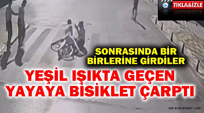 Kahramanmaraş’ta yeşil ışıkta karşıya geçmek isteyen yayaya bisiklet çarptı. Kaza sonrası bisiklet sürücüsü ve yaya yumruk yumruğa kavga etti.