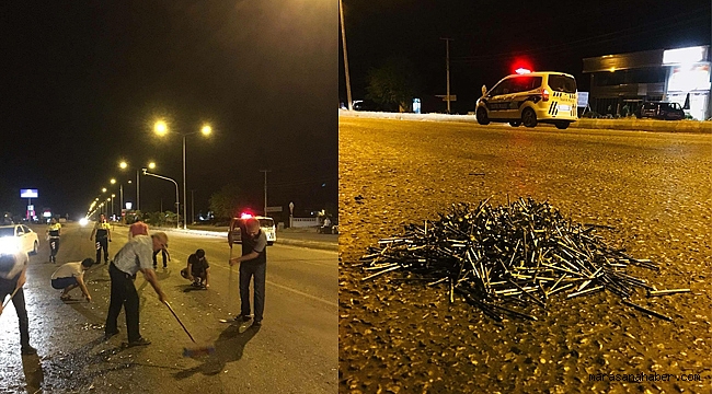 Kahramanmaraş Adana yolu üzerinde yola dökülen çiviler tehlike saçtı. Yola nasıl ve kim tarafından döküldüğü bilinmeyen çiviler görevlilerce toplandı.