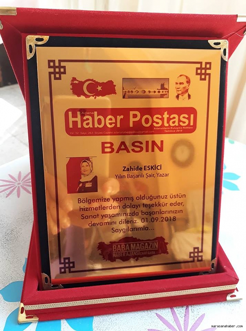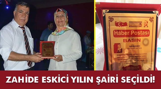Kahramanmaraş’ın Andırın ilçesinde kendisine has yaşam tarzı ve Kahramanmaraş edebiyatına yaptığı katkılarla gündeme gelen Şair ve Yazar Zahide Eskici, merkezi Adana’da olan Baba Magazin Haber Ajansı tarafından yılın başarılı şair ve yazarı seçildi.